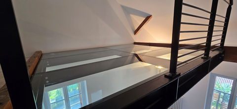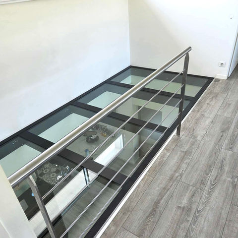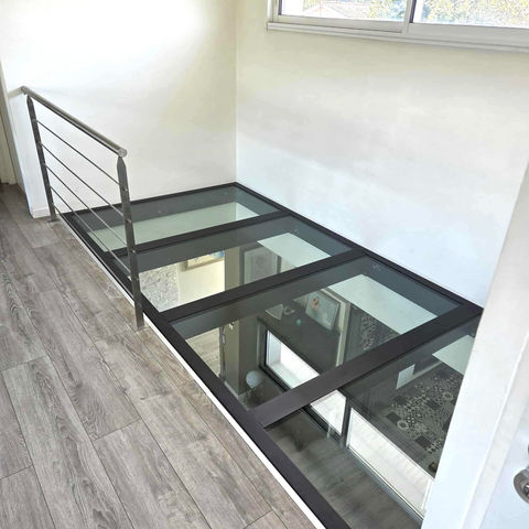 Le plancher de verre est composé de verres tri feuilleté. Personnalisable et sur-mesure: opacité du verre, verres de couleurs, anti-dérapants, sérigraphie...
